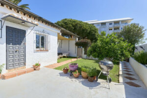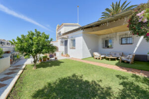 Un frondoso jardín muy bien cuidado rodea la propiedad, con árboles frutales, una gran piscina privada con ducha exterior y un garaje para dos vehículos.