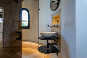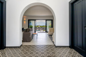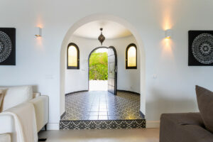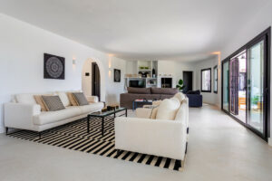 Al atravesar la imponente puerta de arco grande, accede a una espectacular zona de estar de concepto abierto donde el espacio, la luz y el estilo se fusionan a la perfección. Desde aquí, disfrute de vistas ininterrumpidas al hermoso jardín paisajístico, una reluciente piscina y el sereno mar Mediterráneo al fondo, un entorno verdaderamente pintoresco.