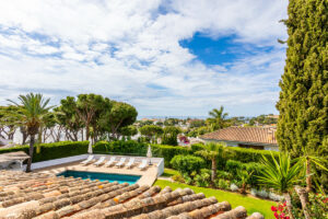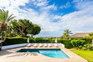 El exuberante jardín de la villa es un remanso de tranquilidad, repleto de árboles maduros, plantas vibrantes y arbustos cuidados. El centro del jardín es una impresionante piscina con elegante tarima de madera y un estiloso bar junto a la piscina, perfecto para recibir invitados. En un lateral de la propiedad, un pequeño huerto con árboles frutales aporta un encantador toque natural.