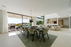 El diseño se organiza en torno a un concepto de planta abierta que conecta sin esfuerzo las zonas de estar, comedor y cocina con amplias terrazas exteriores. Las puertas de cristal de suelo a techo inundan los espacios de luz natural y crean una transición fluida entre interior y exterior. Las distintas áreas de descanso y comedor, tanto cubiertas como al aire libre, ofrecen un entorno ideal para la vida familiar moderna y para recibir invitados con estilo.