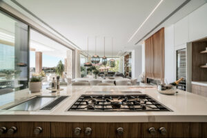 La cocina cuenta con electrodomésticos Gaggenau de alta calidad y gabinetes elegantes de Danespan, combinando el diseño moderno con la funcionalidad diaria. Una oficina casera adyacente ofrece un espacio tranquilo para el trabajo o el estudio.