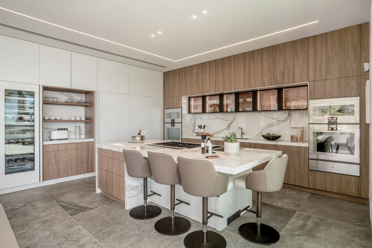 La cocina cuenta con electrodomésticos Gaggenau de alta calidad y gabinetes elegantes de Danespan, combinando el diseño moderno con la funcionalidad diaria. Una oficina casera adyacente ofrece un espacio tranquilo para el trabajo o el estudio.