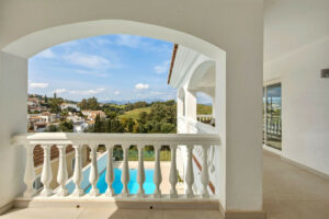 La villa dispone de seis dormitorios, cuatro baños y dos amplios salones. La planta principal cuenta con tres dormitorios, dos baños, un salón con chimenea, zona de comedor y acceso a un precioso porche-terraza con espectaculares vistas suroeste hacia la montaña y Mijas.