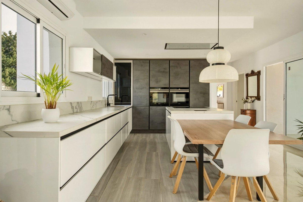 Recientemente reformada con los más altos estándares, la villa ha sido adaptada para ofrecer un estilo de vida cómodo y funcional. Es ideal como vivienda permanente, casa de vacaciones o inversión, ya que ofrece varias zonas independientes, cada una con su propia cocina. La cocina principal es de alta calidad, marca Siemens, y la villa cuenta con tres cocinas totalmente equipadas, incluyendo una cocina en la planta baja con zona de lavandería y frigorífico adicional. La cocina principal también dispone de iluminación ambiental, creando un ambiente cálido y acogedor durante la noche.