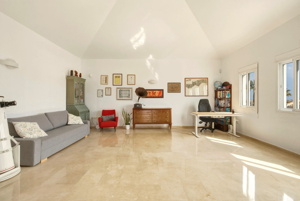 La villa dispone de seis dormitorios, cuatro baños y dos amplios salones. La planta principal cuenta con tres dormitorios, dos baños, un salón con chimenea, zona de comedor y acceso a un precioso porche-terraza con espectaculares vistas suroeste hacia la montaña y Mijas.