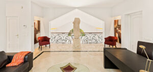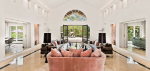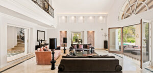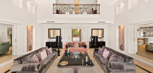 Al entrar por una puerta doble eléctrica, un largo camino conduce al porche delantero de esta elegante y espaciosa propiedad. Uno se encuentra inmediatamente con las impresionantes vistas desde el pasillo de doble altura con una escalera que lleva a una sala de televisión superior y al primer piso, dos dormitorios dobles en suite, ambos con techos abovedados y acceso a terrazas privadas. La planta principal ofrece otros dos dormitorios dobles, un salón formal con techos altos, una acogedora biblioteca con chimenea abierta y una amplia cocina familiar de estilo americano que incorpora un comedor formal, una zona de estar y una moderna cocina de alto brillo con una gran isla central para desayunar. y una gran cantidad de electrodomésticos de cocina. Desde las puertas de la cocina se accede a un comedor exterior cubierto con escalones que conducen al jardín y desde la sala de recepción, las puertas del patio se abren a una gran terraza cubierta.