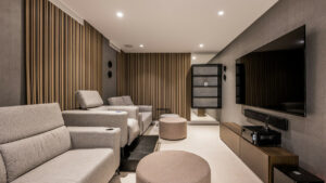 La planta baja de la casa incluye dos dormitorios adicionales, un cuarto de baño, una sala de cine, un lavadero y un garaje privado para dos coches.