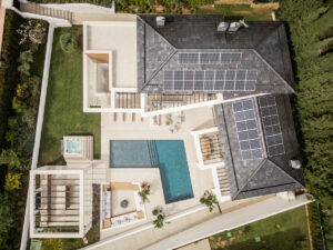 Características como el sistema domótico, la calefacción aerotérmica por suelo radiante, paneles solares y la chimenea en el salón principal añaden comodidad y confort.