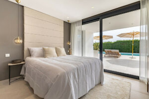 El interior cuenta con un salón de planta abierta lleno de luz, conectado a una cocina moderna y funcional. El dormitorio principal es un verdadero oasis, con acceso directo a la terraza y un baño en suite que combina lujo y calidez natural.