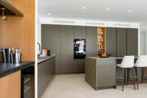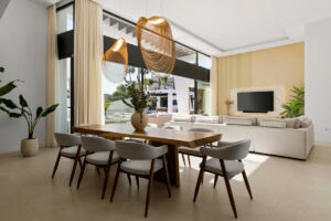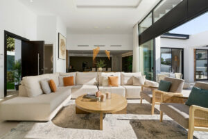 La villa cuenta con seis dormitorios y impresionantes techos de 3,5 metros en el nivel de vida principal, creando un sentido inmediato de apertura y profundidad. Una amplia sala de estar y cocina de planta abierta se conecta directamente a la piscina y espacios de entretenimiento al aire libre, reforzando el estilo de vida que define una villa de alta gama en Marbella. La cocina moderna elegante está totalmente equipada con electrodomésticos Siemens integrados, amplio almacenamiento y una elegante barra seca con dos neveras de vino.
