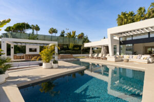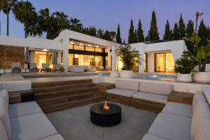 La vida al aire libre es un punto culminante, con amplias terrazas que rodean la piscina, una gran zona de estar con chimenea, un jacuzzi y una cocina al aire libre totalmente equipada con parrilla, neveras, almacenamiento y TV impermeable. Esto crea un entorno ideal para disfrutar y disfrutar del clima de todo el año de Marbella.