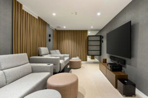 En el nivel inferior, dos amplios dormitorios en suite adicionales se benefician de patios ingleses, garantizando una excelente luz natural y ventilación, haciéndolos perfectos para los huéspedes o familia ampliada. Este nivel también incluye un cine casero insonorizado, un aseo de invitados, un amplio lavadero con almacenamiento adicional, y acceso directo a un garaje doble privado con carga de vehículo eléctrico. La propiedad se accede a través de una entrada cerrada, proporcionando seguridad y facilidad de acceso.