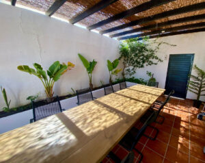 La amplia terraza cubierta es el lugar ideal para cenar y disfrutar al aire libre, con una mesa de madera con capacidad para 14 personas. También cuenta con una zona de relax con sofá y vistas a la piscina y al jardín.