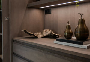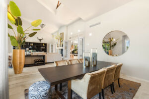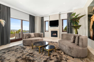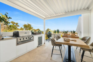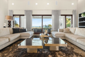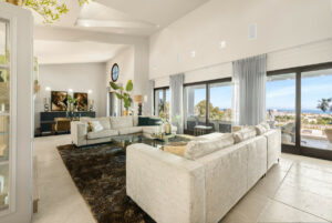El interior de la casa es igualmente impresionante, con la sala principal que exhibe techos abovedados que crean una sensación de grandeza. Un amplio comedor y una segunda sala de estar ofrecen espacios ideales para reuniones formales e informales. La cocina está equipada con electrodomésticos de alta gama Gaggenau, ideales para los entusiastas de la cocina. Al salir, la villa se abre a una amplia terraza con una elegante zona de salón, que conecta perfectamente con la piscina climatizada. La orientación hacia el sur asegura una abundancia de luz natural durante todo el día. Esta impresionante villa también cuenta con una hermosa zona de barbacoa, perfecta para comer al aire libre y socializar mientras se disfrutan de las espectaculares vistas.