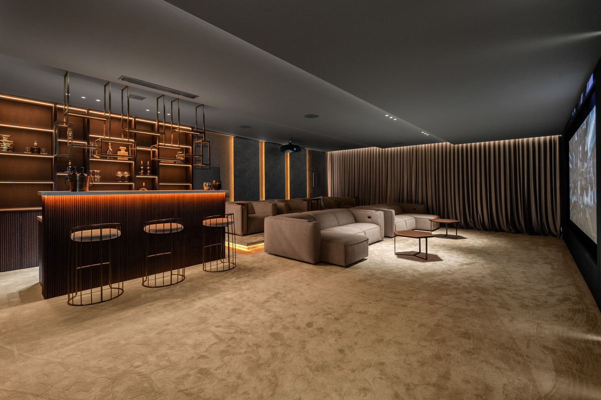 La planta baja ofrece una extraordinaria sala de cine de lujo, un elegante bar perfecto para socializar, un gimnasio Eleiko totalmente equipado, una rejuvenecedora sauna, una oficina privada para la máxima productividad, dos habitaciones adicionales para huéspedes con baños en suite, y un amplio garaje con espacio para cinco coches, todo diseñado con la mejor atención al detalle.