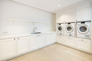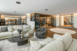 En este nivel, también encontrará dos amplios dormitorios en suite, cada uno con acceso directo a los hermosos jardines ajardinados, mejorados por exquisitas características de piedra que crean un ambiente tranquilo. La cocina moderna de planta abierta, equipada con electrodomésticos Gaggenau de primera calidad, equilibra estética escandinava elegante con alto rendimiento, creando un ambiente ideal para la cocina diaria, así como huéspedes.