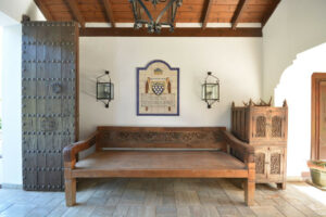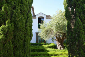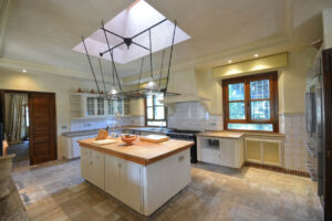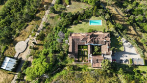 La distribución actual tiene, en la planta baja: patios ajardinados de entrada con fuentes de agua y antiguos olivos, vestíbulo de entrada con techos muy altos, vigas de madera y una majestuosa escalera que conduce a una hermosa suite principal, vestidor y baño, además de una zona de estar con vistas al amplio salón. También hay una sala de cine muy espaciosa, un gran comedor con chimenea y una gran cocina al lado. Al otro lado del vestíbulo hay otras tres suites con habitaciones dobles. Toda esta área da acceso a una gran terraza cubierta y abierta que da al jardín, la piscina y el bosque. Aquí es donde está la barbacoa y el comedor al aire libre.