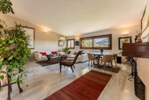 – Segundo nivel: Un gran salón principal que se abre a una amplia terraza cubierta con zona de estar y barbacoa, disfrutando de vistas panorámicas al jardín, piscina, montañas y Marbella paisaje urbano.