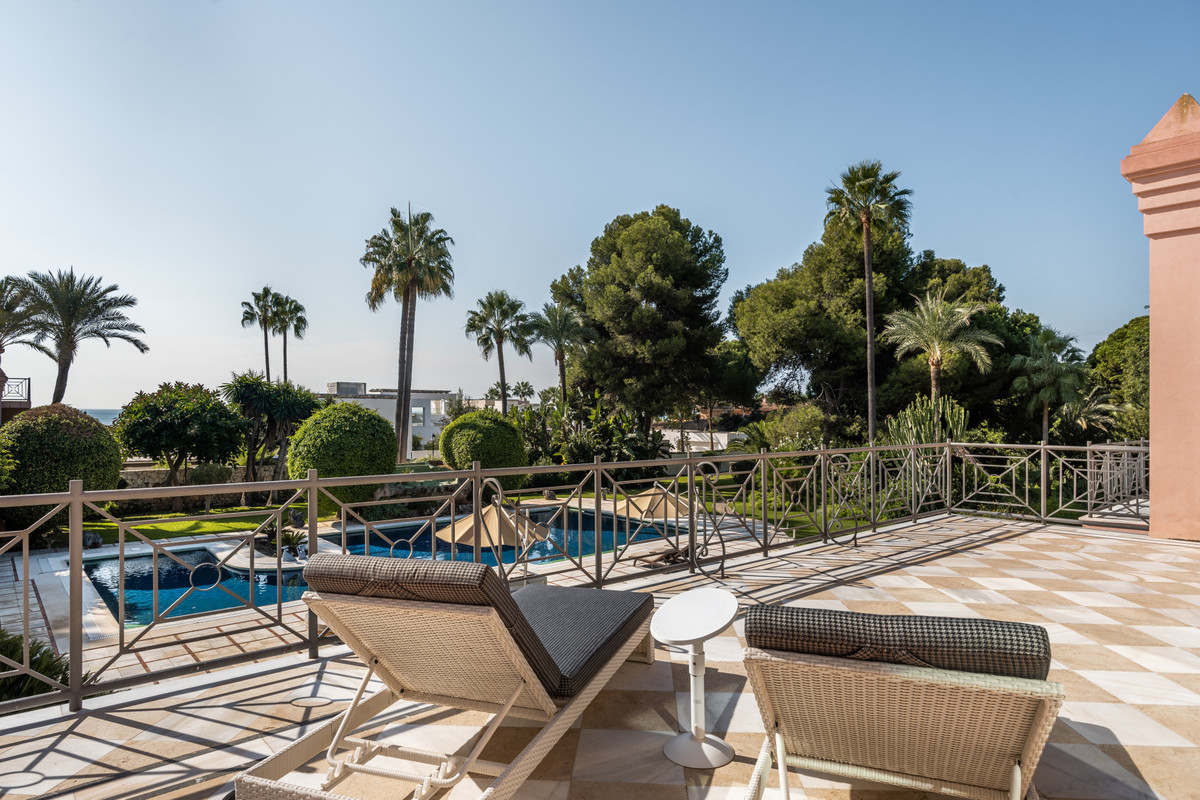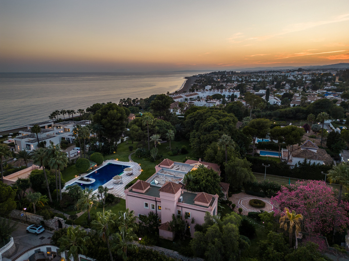 Ubicada en una impresionante parcela de 7.415 m², esta residencia palaciega, considerada una de las 20 mejores casas de Marbella, cuenta con 8 dormitorios, 8 baños y una casa para el conserje con 2 dormitorios y un baño. También hay potencial para construir una casa adicional de 500 m².