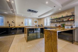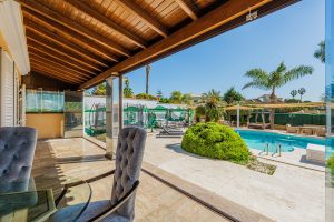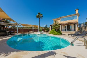 En la planta alta, la parte derecha de la vivienda acoge un dormitorio con vestidor, baño en suite y terraza privada, mientras que en la parte izquierda se encuentran dos dormitorios adicionales, un vestidor independiente y un baño completo. El nivel sótano dispone de una acogedora zona de bodega con chimenea y cocina equipada, una despensa, tres dormitorios, un baño y acceso directo tanto al garaje cubierto como a la vivienda principal. Entre las prestaciones de la vivienda destacan el aire acondicionado, el sistema de riego automático, las placas solares, los suelos de mármol blanco y beige, la tarima de madera en los dormitorios, las ventanas arqueadas de aluminio y las losas con efecto piedra en las zonas exteriores.
