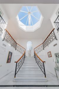 Encantadora villa de estilo mediterráneo en Puerto de la Torre, con amplias zonas exteriores pavimentadas, cuidados espacios ajardinados y elegantes interiores distribuidos en tres niveles. La vivienda da la bienvenida con un vestíbulo de estilo clásico, presidido por una imponente escalera doble de mármol blanco que se abre en dos direcciones. Las barandillas de hierro forjado con detalles ornamentales, junto con los pasamanos de madera, aportan un aire sofisticado y atemporal. Un gran lucernario octogonal en la parte superior inunda el espacio de luz natural, realzando aún más su amplitud, mientras que una escultura clásica situada en el rellano central refuerza la elegancia del conjunto.