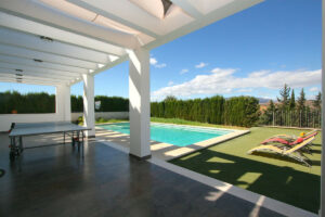 La propiedad ofrece varias acogedoras zonas de estar al aire libre, perfectas para relajarse o entretener a los invitados. El jardín, con su preciosa piscina y las montañas de fondo, crea un ambiente tranquilo y privado.