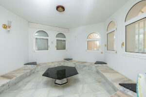 La cuidada distribución continúa con una singular sala redonda más pequeña, adornada con asientos de piedra y una mesa, un espacio acogedor para relajarse y disfrutar de la tranquilidad del entorno. A la derecha de la entrada, un pasillo con armarios empotrados garantiza un amplio espacio de almacenamiento, mientras que el primero de los dormitorios cuenta con armarios empotrados, un cuarto de baño en suite con ducha y una terraza privada.