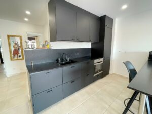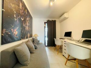 * Cocina transformada en un tercer espacio versátil: dormitorio/oficina con sofá cama doble y escritorio abatible.