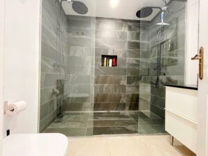 * Recibidor que conduce a 2 dormitorios y un baño de invitados renovado, con amplia ducha de obra y dos cabezales de ducha.