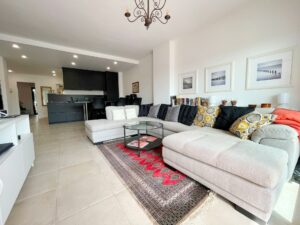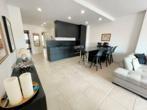* Amplio salón conectado con cocina contemporánea con gran isla central, perfecto para comidas informales y reuniones.
